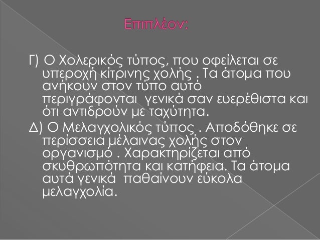 - Γ) Ο Χολερικός τύπος, που οφείλεται σε υπεροχή κίτρινης χολής . Τα άτομα που ανήκουν στον τύπο αυτό περιγράφονται γενικά σαν ευερέθιστα και ότι αντιδρούν με ταχύτητα.